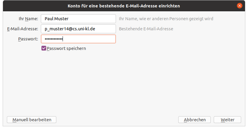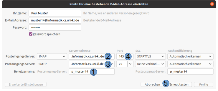 | 1. | Der Accountname (z.B. p_muster) muss auf p_muster@informatik.uni-kl.de ergänzt werden. |