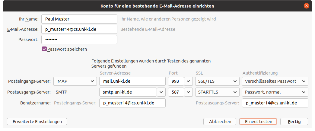 | 2. | Posteingang-Server muss in mail.uni-kl.de geändert werden. |